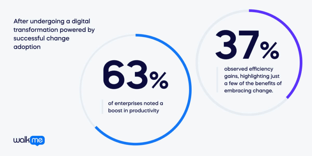 After undergoing a digital transformation powered by successful change adoption, 63% of enterprises noted a boost in productivity, while 37% observed efficiency gains, highlighting just a few of the benefits of embracing change.