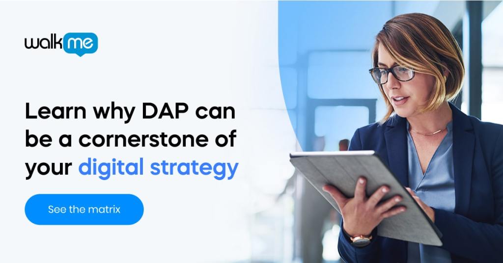 In the matrix, Gartner® classifies digital innovation tools based on three main metrics – business value, feasibility, and organizational ambition. Digital Adoption Solutions are listed as a core ambition to a digital strategy, ranking as a leading technology based on business value and feasibility.