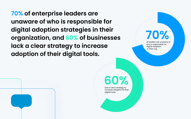 According to WalkMe’s State of Digital Adoption 2022-2023 report, 70% of enterprise leaders are unaware of who is responsible for digital adoption strategies in their organization, and 60% of businesses lack a clear strategy to increase adoption of their digital tools.