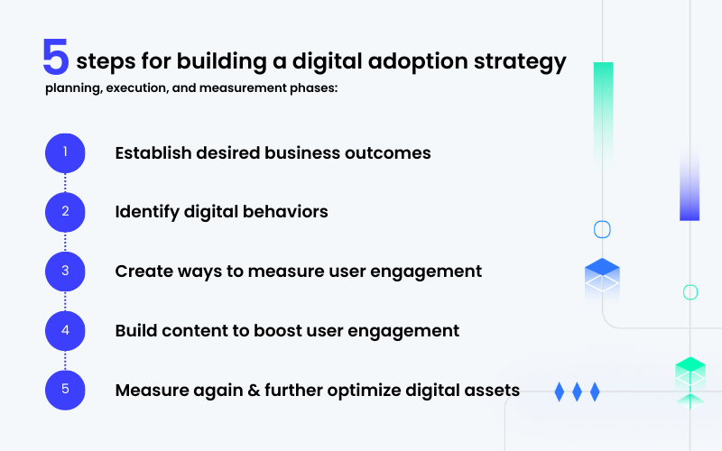 Building out your digital adoption strategy can be broken down into the following five steps that span the planning, execution, and measurement phases.