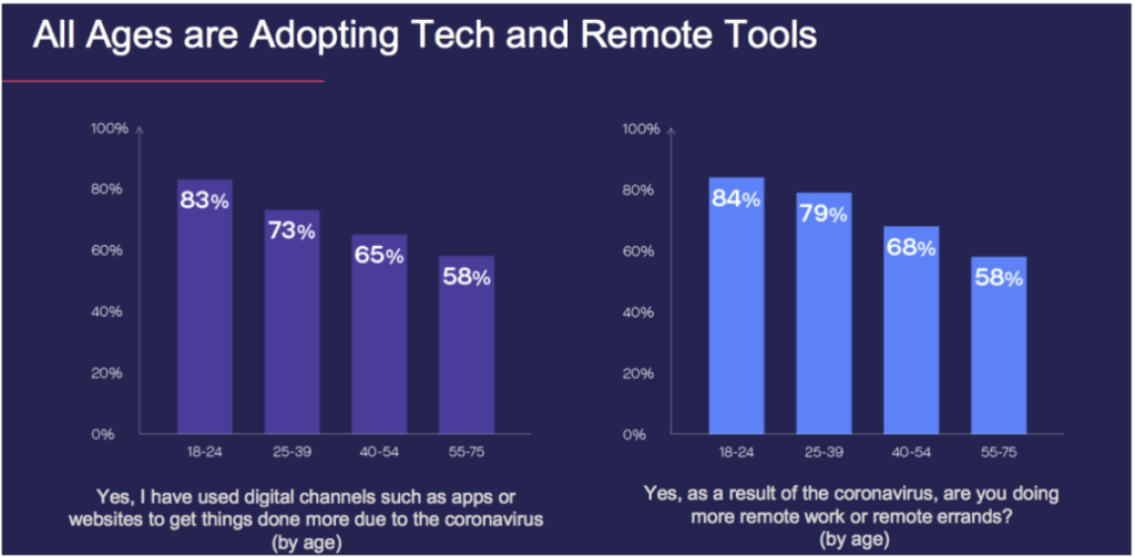 On the flip side, customers are exhibiting high levels of openness to using new technology to work remotely or run errands. The vast majority of younger people aged 18 to 24 are adopting more remote tools in light of the coronavirus, at a rate of 83%. But even the oldest group in the survey, Americans aged 55-75, are turning to remote ways of working and consuming at a rate of 58%. In fact, there isn’t a single age group that isn’t exhibiting higher levels of interest in remote tools.