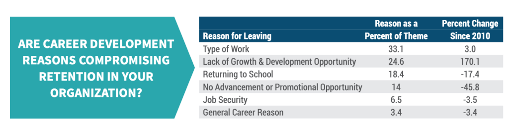 According to the Work Institute, career development continues to be the leading cause of employee turnover in the U.S. with a lack of growth and development opportunities cited as a trend with a 170% increase since 2010.