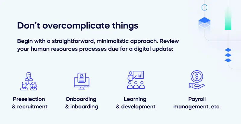 Start with a straightforward approach. Review HR processes due for a digital update, such as recruitment, onboarding, learning and development, and payroll management.