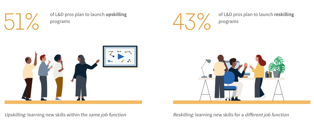 As the needs of organizations shift, employees’ roles might as well. Employee development plans will include reskilling to teach workers new skills for a different job function and upskilling to make sure an employee has the proper knowledge to perform their current job.