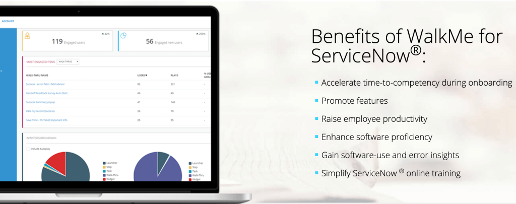 WalkMe for ServiceNow, for instance, has modules that take users step-by-step through a series of actions or tasks, eliminating the need for classes, research, or technical support.