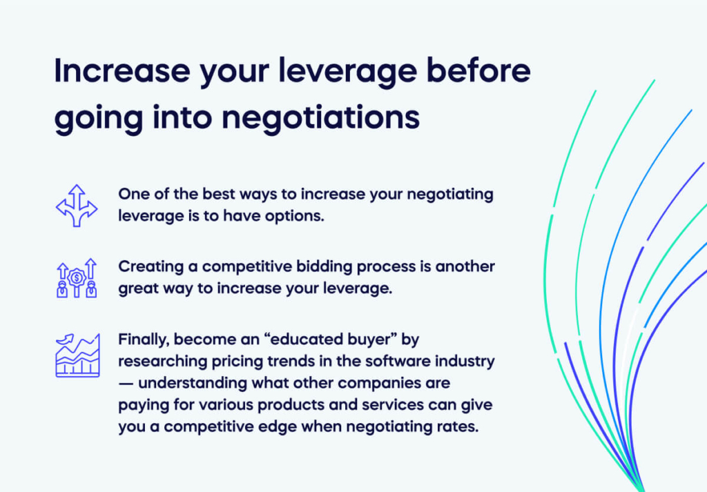 Finally, become an “educated buyer” by researching pricing trends in the software industry— understanding what other companies are paying for various products and services can give you a competitive edge when negotiating rates.