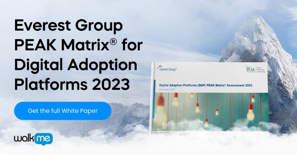 To learn more about how WalkMe can help power your digital adoption efforts, download your free copy of the Everest Group PEAK Matrix® for Digital Adoption Platforms 2023 today.