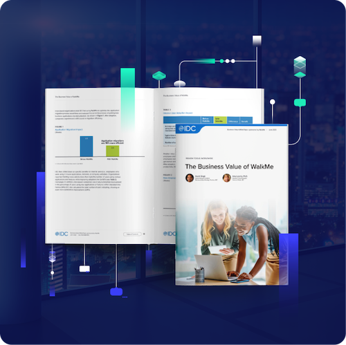 WalkMeによって3年間でROI 494%創出 あらゆる業界の従業員が、新しい機能の習得と並行してアプリケーションやワーク フローを駆使しなければならないという課題に直面している。 この課題は、何百時間 にも上る累積的な生産性の損失につながり、従業員のモチベーションを低下させる 恐れがある。 同様に、企業は利用中のアプリケーションの数を把握し、シャドーIT への取り組み管理、ワークフロー全体でユーザーが直面する使用時のボトルネックを 排除することに苦慮している。 このような課題の解決に寄与するのがWalkMeのような DAP(Digital Adoption Platform:デジタルアダプションプラットフォーム)である。 IDCは、WalkMeを利用してビジネス運用をサポートおよび強化している企業が実現し たビジネス価値に関する調査を実施した。このプロジェクトでは、WalkMeの費用対 効果を体験した8社へのインタビューも行われた。 これらのインタビューから得た広範な定量的/定性的データに基づき、 IDCは、調査参加企業が次のような方法で重要なビジネス価値を実現し、 3年間のROI(Return on Investment:投資利益率)が494%になると 算出している。