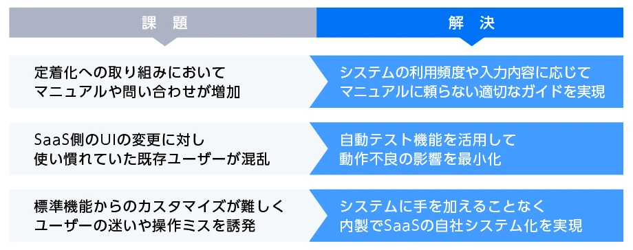 「WalkMeで解決すべき課題や解決イメージを描くことができるビジネス理解者、業務を理解している業務担当者、システムの操作・機能を把握しているシステム理解者が依頼部門として三位一体となり、ここにWalkMeの機能を把握・実装する開発担当者が加わり、自分ごととして導入を進めていきました。最適なメンバーを揃えることで、目指すべき効果の実現と効率的なプロジェクトの推進を可能にしたのです。内製化により、社内で迅速かつ効率的な対応が可能になり、WalkMeのシャドーIT化も防止できました。」
