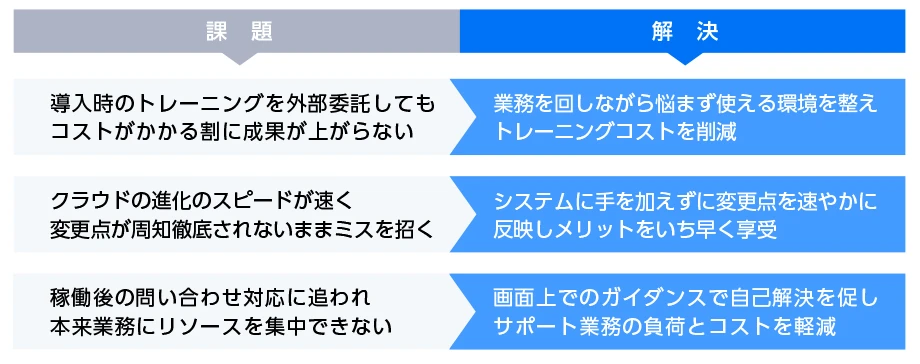 WalkMeは、単なる定着支援にとどまらず、ユーザーが迷わず操作しながら自然と業務理解を深められる“自走型のガイダンス”を実現し、システムの進化や運用変更にも柔軟に対応できる仕組みを提供します。ヨコオでは、ServiceNowの初期展開にあたり、業務フローやユーザー特性に応じてインアプリ・ガイダンスを段階的に設計。従来必要だった数百万円規模のトレーニングを行うことなく、利用定着と運用効率化を同時に実現しました。さらに、手順書の改訂や問い合わせ対応といった運用負荷も大幅に軽減。導入初期から、WalkMe上でのガイダンス設計を業務理解に応じて段階的に進めたことで、従来型の一括トレーニングや手順書整備に頼らずとも、ユーザーが自律的に活用を開始できる環境が整っています。